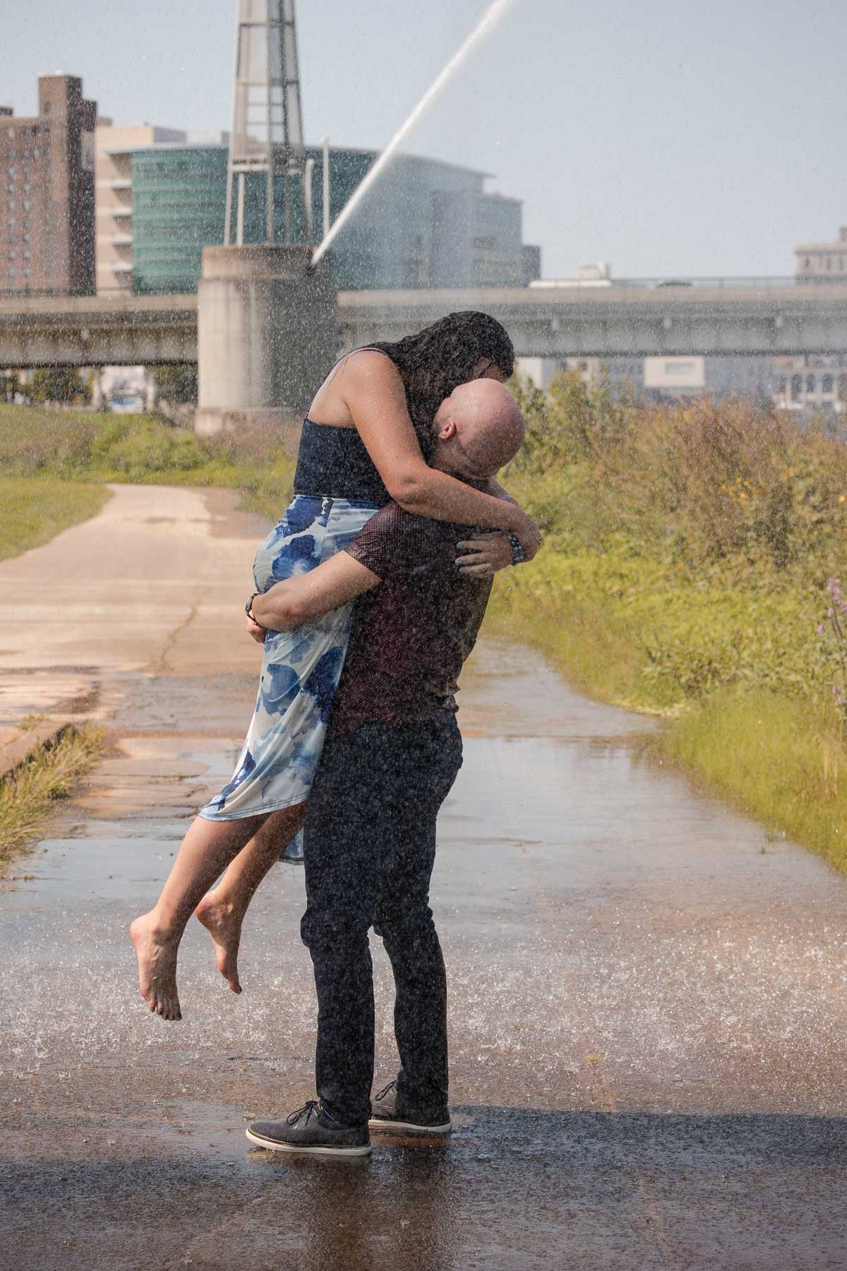 What made this session extra fun is that we ended the shoot in the RiverScape MetroPark fountains. We knew the Riverscape fountain schedule ahead of time and made sure to be there early. As soon as the water started shooting out, we ran down the hill to the bike path. They only ran for a few minutes, and we acted fast. They danced in the fountain, hugging and kissing each other the entire time. It was incredibly fun. The couple was 100% soaked by the end. Thankfully, my professional camera gear is weather-sealed and sustained no damage.