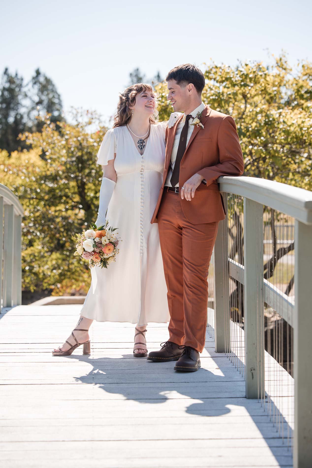 In 30 seconds, I had to find a location that offered privacy, shelter from rain, and a great view. I enjoy quick problem-solving to get the best shots for my couples. I chose the picnic area overlooking the Monet Bridge and fall foliage. Many pick the small bridge, but it has little room to work. From this spot, we captured the lake, bridge, and colorful trees. The photos turned out great.