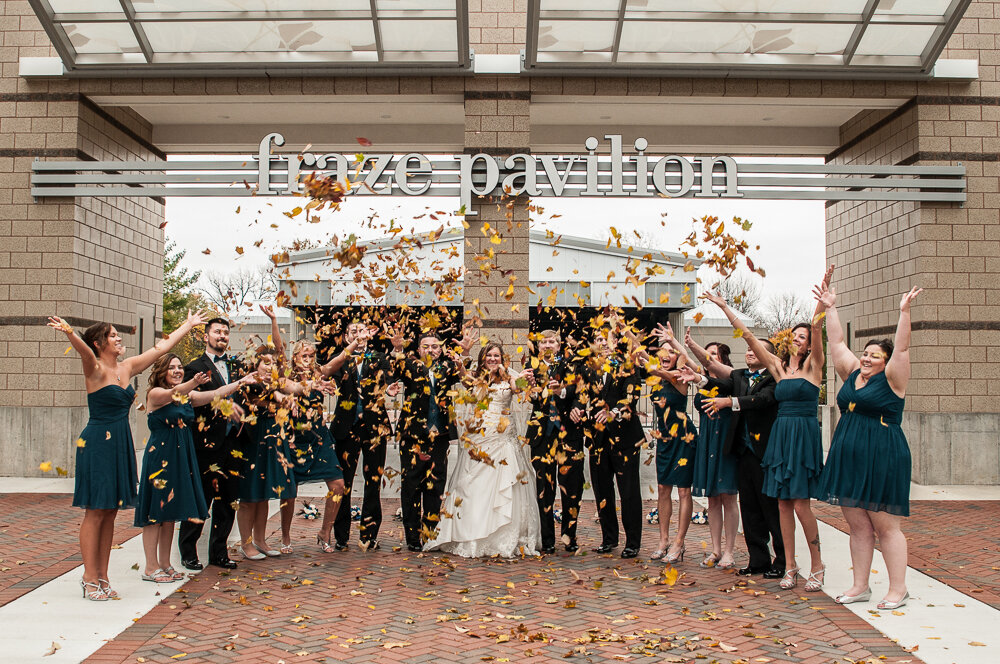 After a beautiful Dayton wedding ceremony, Bethany’s wedding party and I headed to Fraze Pavilion in Kettering, Ohio for fifteen minutes of unique, on-location Dayton wedding photography. This is the second wedding of the year that I’ve taken Fraze Pavilion wedding photos. Working with a limited amount of time, I was able to utilize props such as umbrellas and flowers to create one-of-a-kind images for this fun bride and groom. We were also able to throw fallen leaves into the air to create a colorful plume of leaves in front of the Fraze Pavilion entrance.
